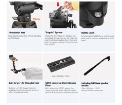 בסיס היברידי ורסטילי – הראש מאפשר מעבר מהיר בין בסיס חצי-כדור (Ball) בקוטר 75 מ"מ להתקנה על חצובות וידאו, לבין בסיס שטוח (Flat Base) עם הברגת 3/8-16 להתקנה על סליידרים וג'יבים.